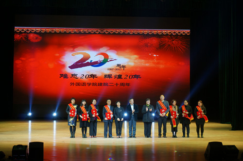 随后进入颁奖环节。奖励对象分别是在学院工作二十年的现任教师8人、曾经在我院担任学院和分团委的领导为学院发展做出突出贡献的5人。外院这二十年来的发展离不开他们的辛勤耕耘,希望借此活动来表达对他们最真诚的感谢和最真挚的祝福。