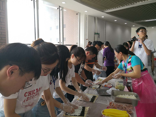 本学期的文化体验课以韩国传统饮食文化体验模块完美收官。韩国饮食文化体验以汇报演出的形式在教工食堂隆重举行。在同学们载歌载舞的开场仪式后,朝语系全体教师及外教带领学生和参与指导的分团委老师制作了紫菜包饭、韩式炒年糕,韩式葱饼、韩国拌饭等韩国传统美食。同学们纷纷表示,这是长春最正宗的韩餐,并表示感激老师们的辛劳付出,这一个学期他们真正体会到了原汁原味的韩国文化。