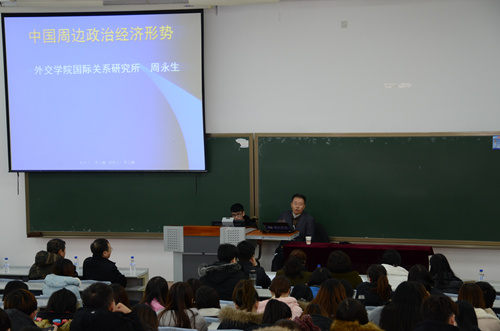 周永生教授在报告中就“中国周边地区政治经济形势”作了详细解读,主要内容包括:中美关系好转,日美同盟的战略地位,美国、俄罗斯、日本和欧洲四大势力的角逐等。同时他提及了“要坚持睦邻友好,守望相助;讲平等、重感情;常见面,多走动;多做得人心、暖人心的事,使周边国家对我们更友善、更亲近、更认同、更支持,增强亲和力、感召力、影响力”的中国周边外交方针。