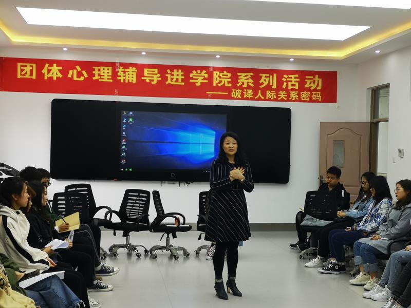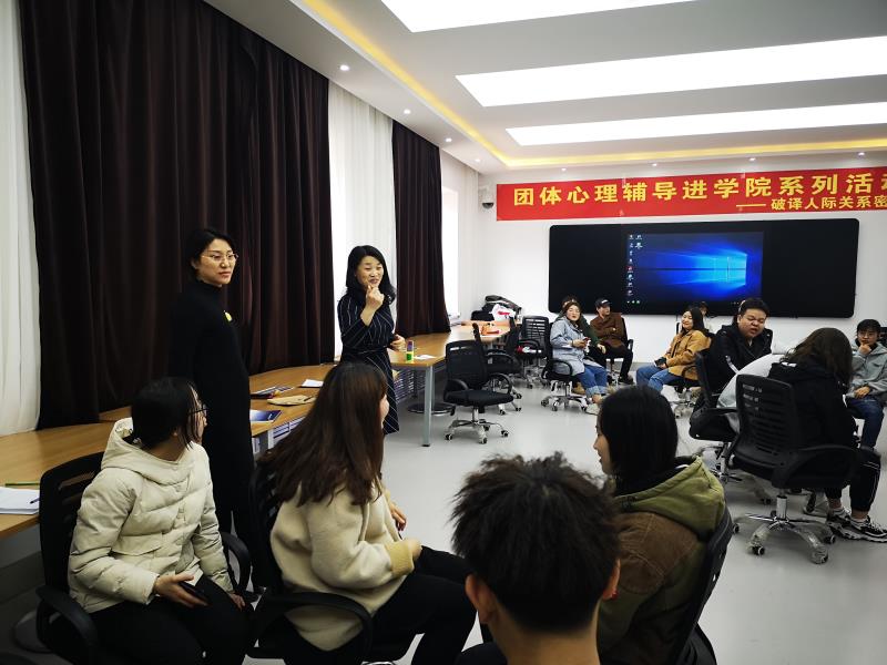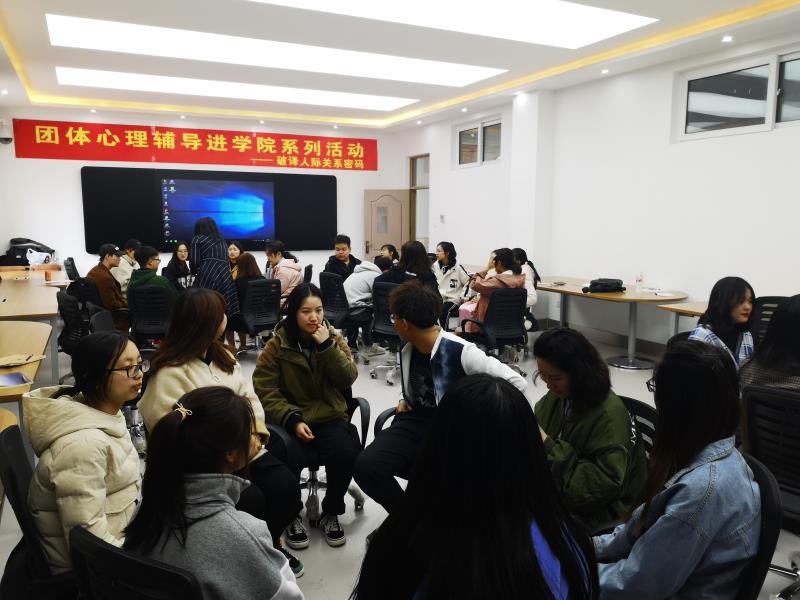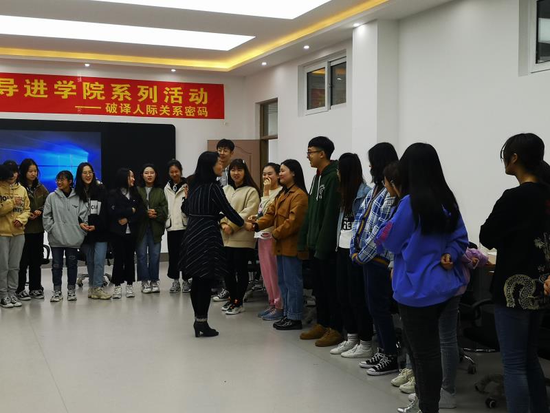 4月9日下午,由学工处主办的团体辅导进学院系列活动之破译人际关系密码在1220教室举行,外语学院的部分同学参加了此次活动。仁爱心理学校的崔老师向同学们讲述了处理人际关系的四个原则,使同学们在人际交往中闪现积极乐观的正能量,强调了肯定他人价值,彼此尊重的重要性。