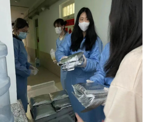 为同学义务发放一日三餐及饮品。餐盒配送不但是体力劳动,更要求每道程序都要严谨无误,否则就会出现餐品和饮品不够的情况。临时党支部带领青年志愿者们科学规划、合理分工、协调合作,从取餐时的数目核定到发餐时的有序配发,再到分发结束后的再次核定,每个环节都做到井然有序、有条不紊、忙而不乱,充分保证了每位同学都能按时就餐。