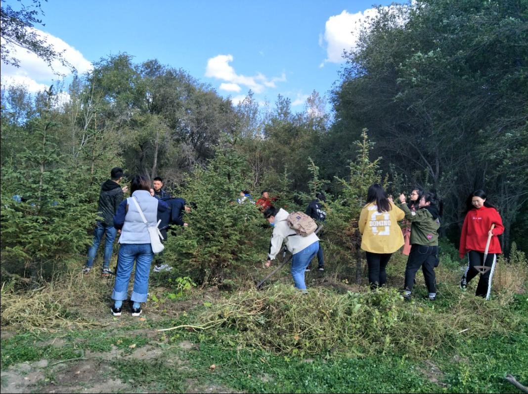 参加党日活动的师生们一路兴致高涨,至校友林便开始行动,领取锄头整理云杉林。学生党员分工协作,发扬“不怕脏,不怕累”的精神,表达对优秀校友的仰慕之情。中午的时光大家不亦乐乎,郁郁葱葱的云杉屹立于春风之中,给校园增添了绿意,活动接近尾声,活动参与者合影留念,共同记录这美好的时刻,期待明年校友林枝繁叶茂。