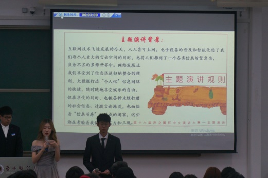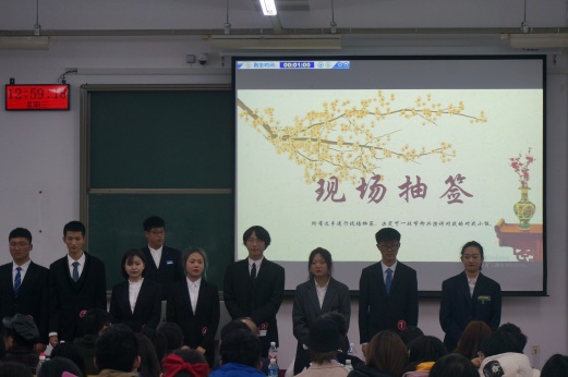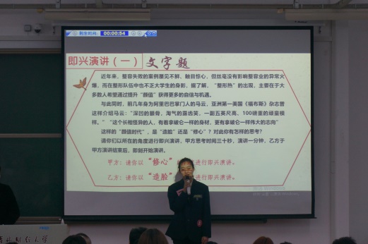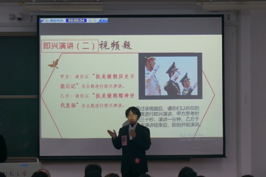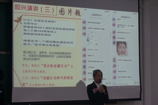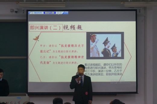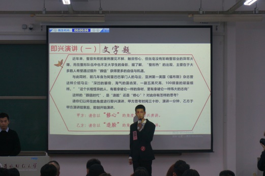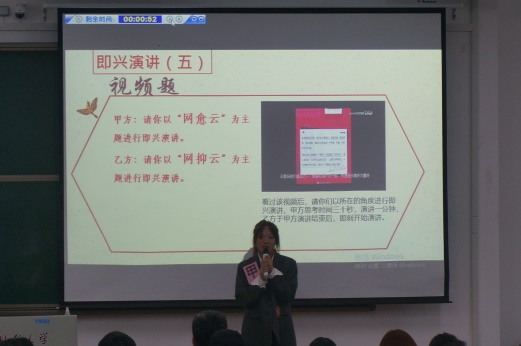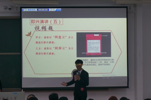 所有选手现场抽签,决定在即兴演讲环节的对战小组。两人为一组,任选一题目,根据所给主题围绕题目进行即兴演讲。即兴演讲的内容分为图片题,视频题,文字题和背景题。限时一分钟。选手们积极发挥自己的想象,各抒己见,让整个比赛精彩纷呈。