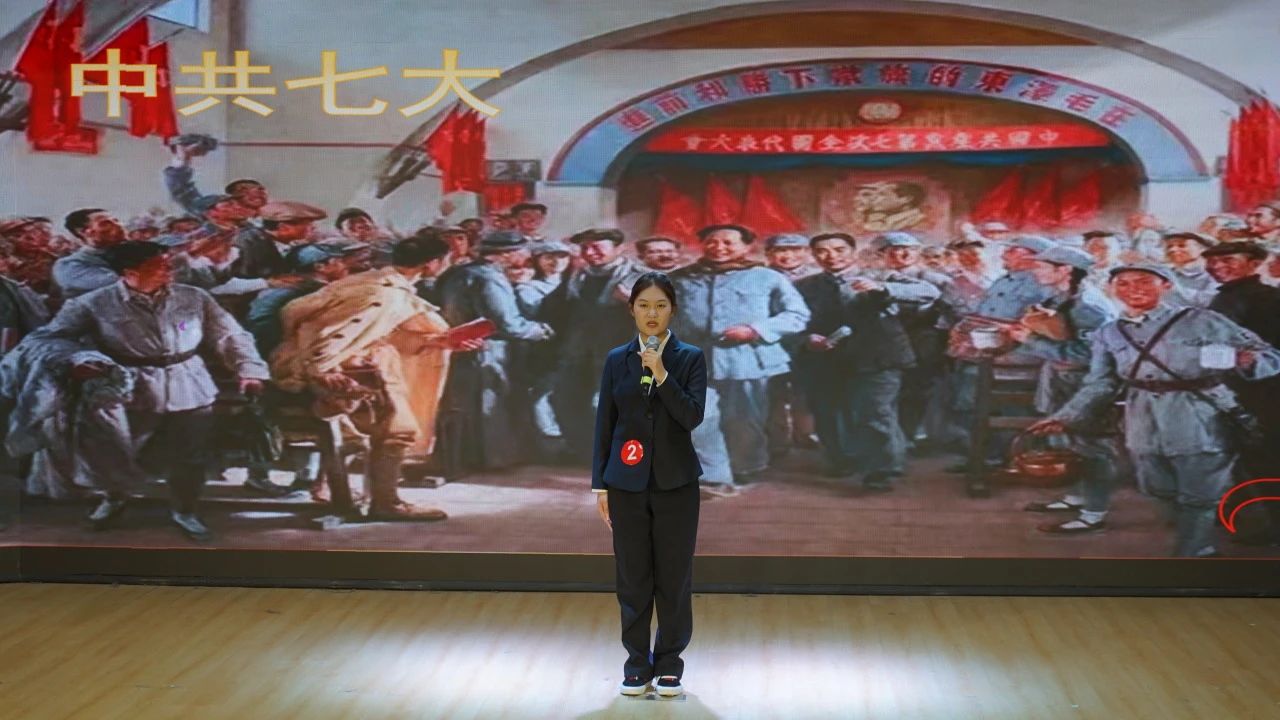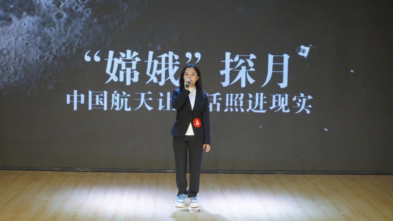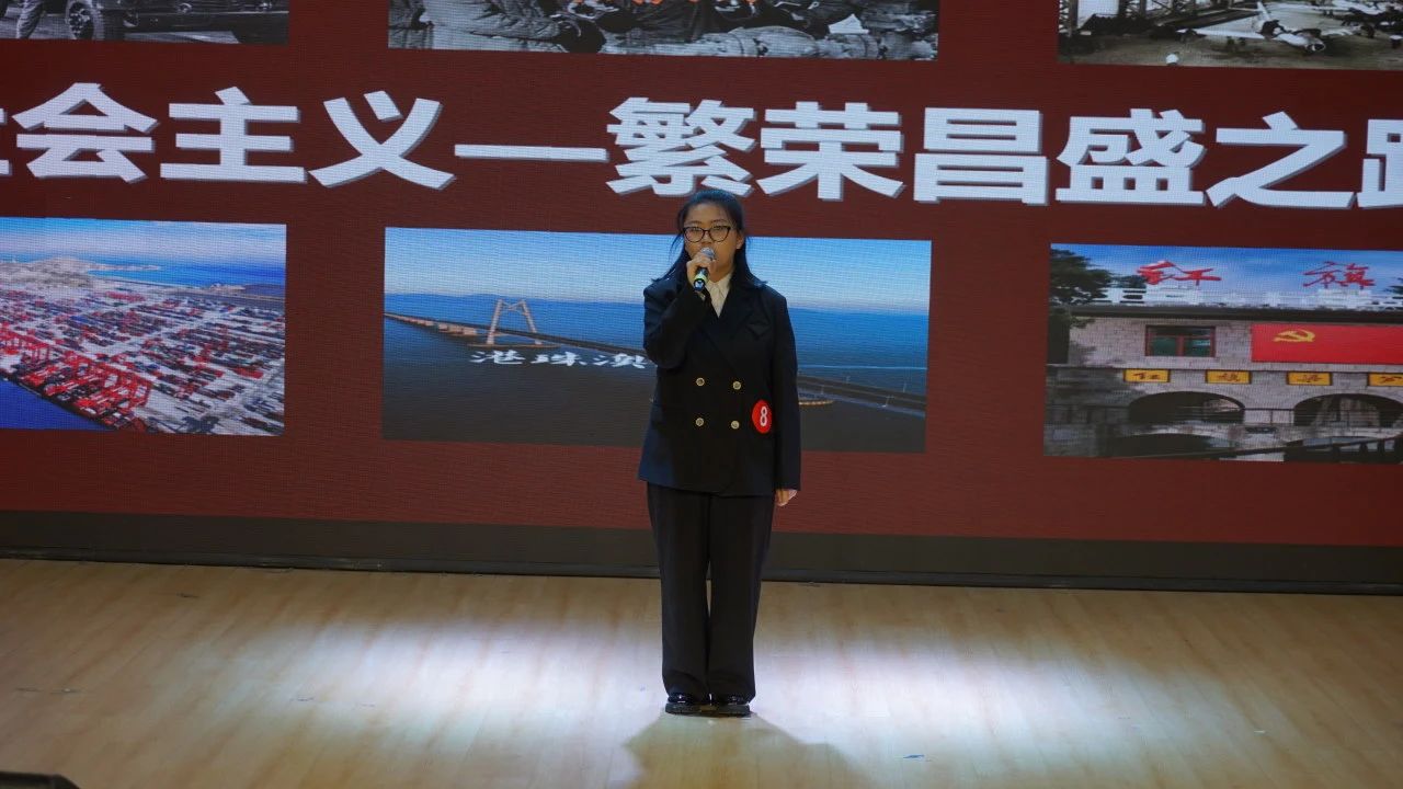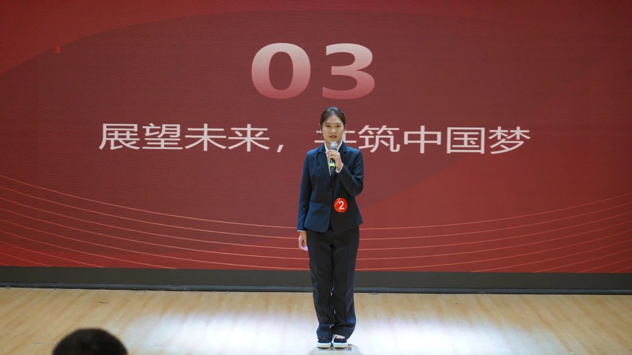 八位选手按照事先抽签顺序,围绕“七十五载披荆斩棘,未来征程破浪乘风”展开主题演讲。这一环节分为选手自我介绍视频和演讲两部分。