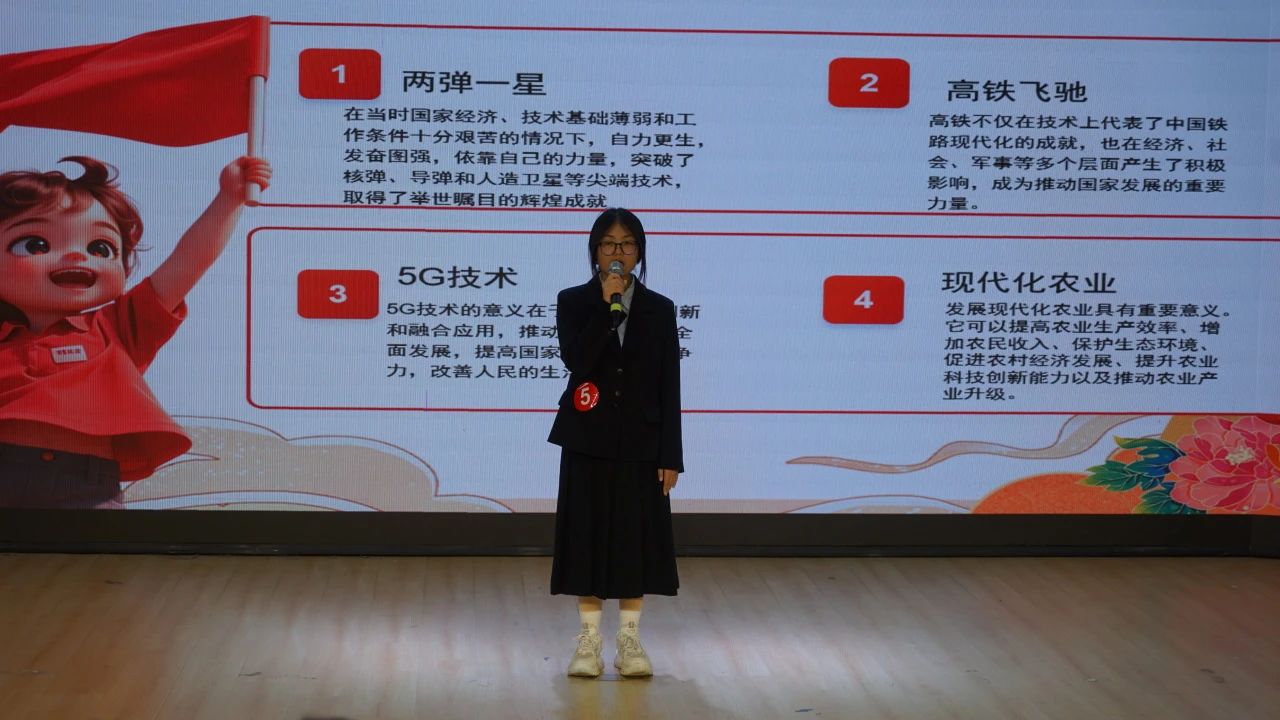 选手们意气风发,自信上台。演讲内容精彩纷呈,从不同的角度展现了一幅波澜壮阔的历史画卷。他们以时间为轴,从新中国成立之初的百废待兴,到改革开放的春风吹遍大地,再到如今在科技、文化、外交等多领域的傲人成就,用生动的事例和详实的数据,让观众仿佛置身于历史的长河,亲眼目睹新中国一步一个脚印的坚实发展。