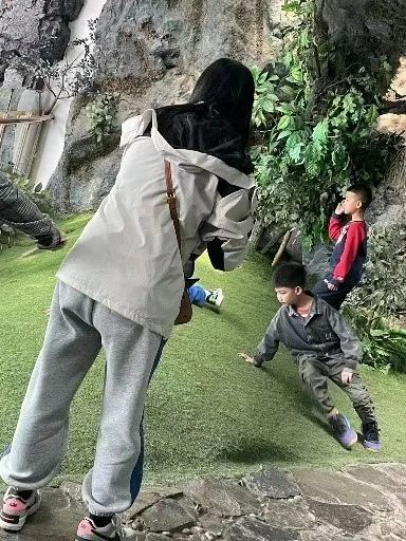 “哎,小朋友,展馆内不可以追逐打闹,小心别摔到哦。”