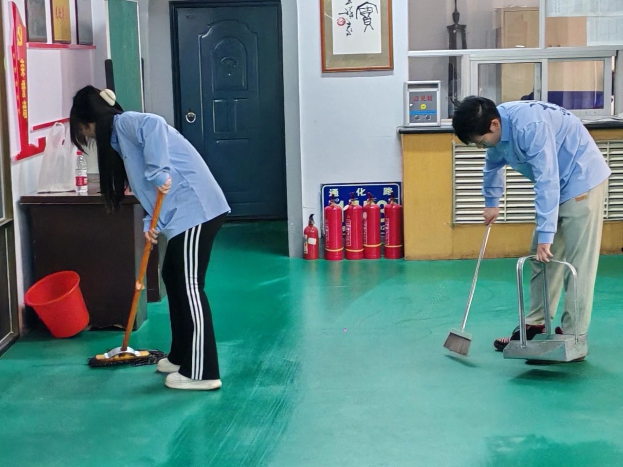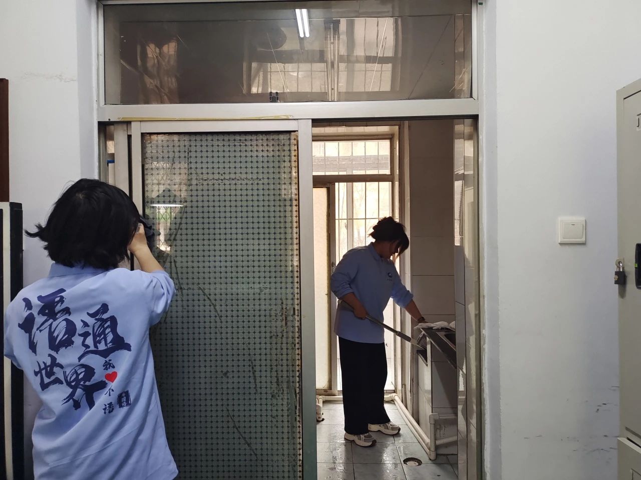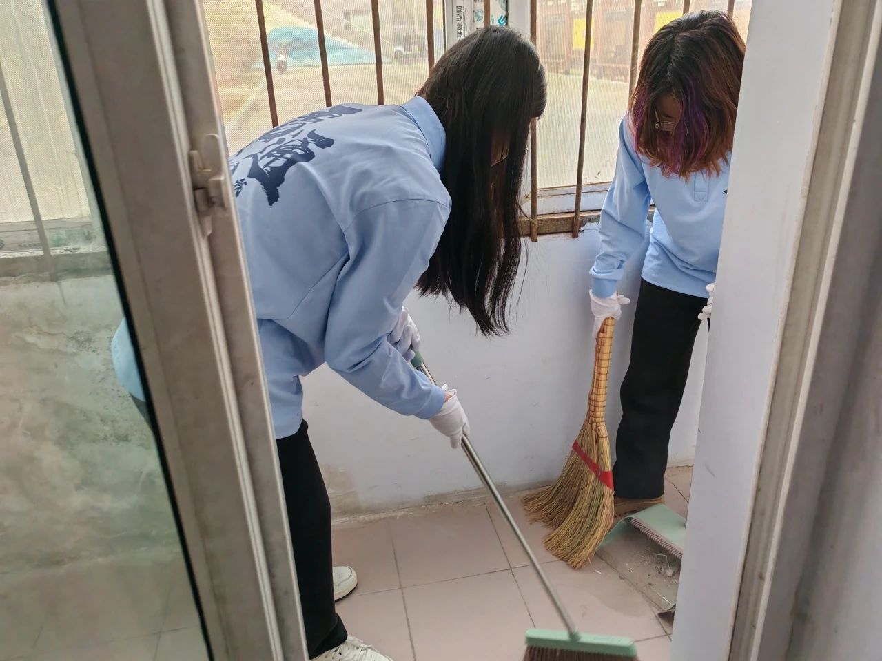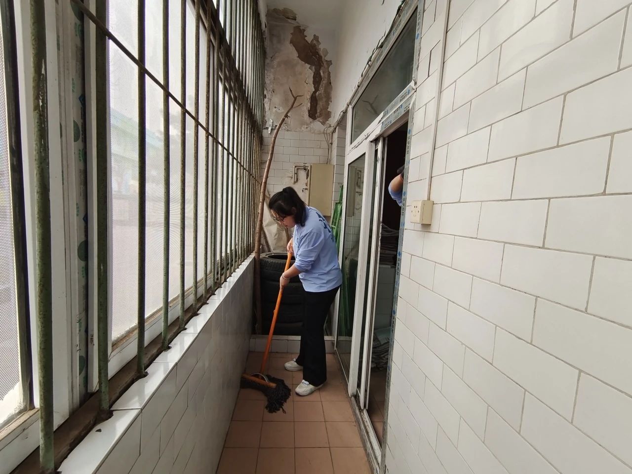 公共区域的清扫同样细致入微。志愿者们或执扫帚清理地面浮尘,或握拖把反复擦拭地砖。还对玻璃门窗进行了深度清洁擦拭。