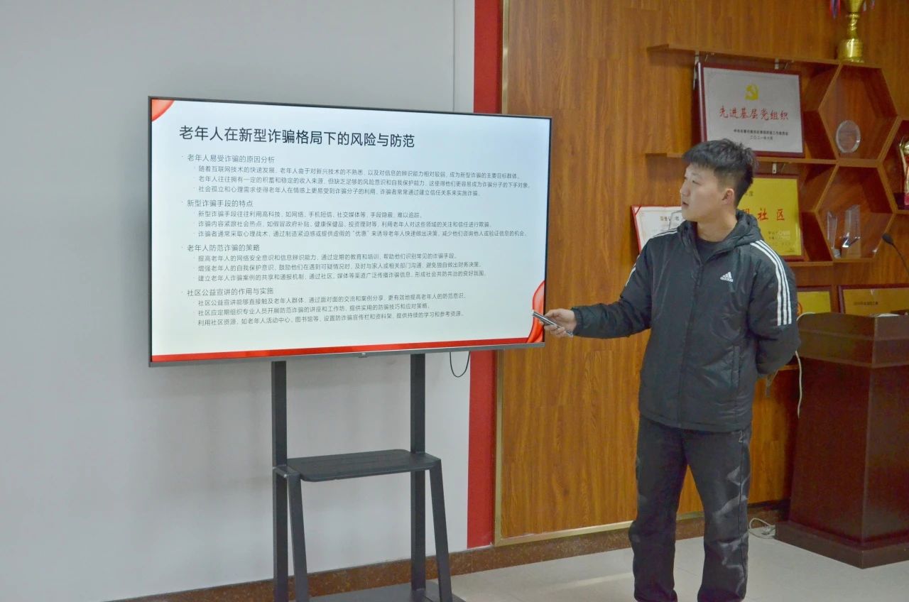 志愿者王煜博介绍了本次活动的目的、流程,并详细讲解了电信诈骗的常见类型,包括:保健品诈骗、冒充亲属诈骗、虚假投资诈骗、“免费领取”陷阱等。他结合本地真实案例,讲解了骗子的话术和作案手法,重点提示“三不一多”的防范技巧,即不轻信、不透露、不转账、多核实,有任何疑点要及时联系家人、社区或报警。活动还设置了互动环节,“诈骗话术猜猜看”播放了冒充客服、中奖电话等骗子录音片段,“紧急情景演练”由志愿者扮演骗子,模拟诈骗场景,社区老人现场应对,用实际演练提升了老人防诈意识。