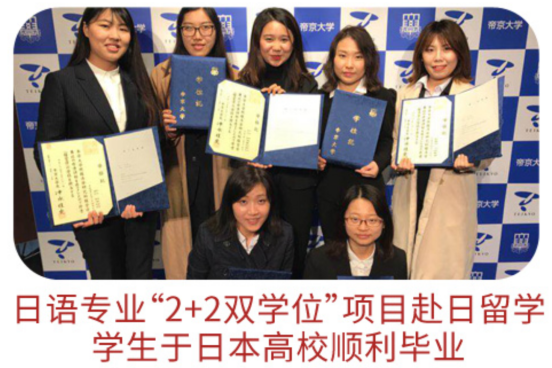 日语专业(经贸方向),现与日本帝京大学、北海道文教大学实行“2+2”联合培养项目。在校生可以从大三年级第二学期开始出国深造,毕业时可同时获得两所学校的毕业证书与学位证书。此外,在校生还可以选择赴日本帝京的半年交换留学项目,或者日本札幌国际大学的“2+2”留学项目。