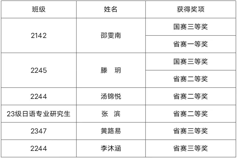 在省赛环节中,我校日语系6名学生获得奖项;在国赛环节中,日语系2名学生荣获国赛奖项。其中,2143邵雯南荣获翻译类国赛三等奖和省赛一等奖,2245滕玥同学荣获翻译类国赛三等奖和省赛二等奖。2244汤锦悦、23级研究生张滨获省级翻译类省赛二等奖,2244李沐涵、2347黄路易荣获翻译类省赛三等奖