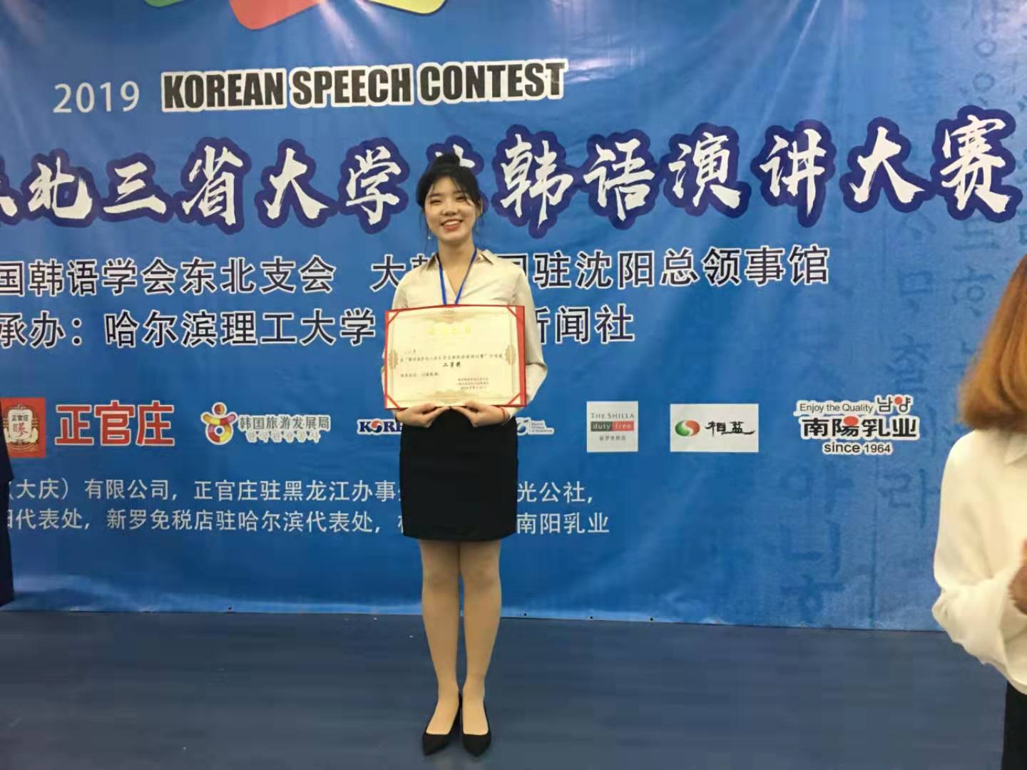 本届东北三省大学生韩语演讲大赛由韩语学会和韩国驻沈阳大使馆主办,哈尔滨理工大学和黑龙江新闻社承办,驻沈阳韩国总领事馆金真爱文化领事、韩国语协会权在一会长、成道立德地产公司代表、大韩航空沈阳代表、正官庄黑龙江地区经理,及新罗免税店哈尔滨代表处代表等社会各界知名人士出席比赛现场。东北三省开设韩语专业的52所高校通过选拔,最终来自25所大学的26名同学参加决赛。赛事分为自由演讲和主题演讲两个部分,我校外语学院韩语系王昡寒凭借标准的发音、扎实的基本功、饱满的热情和广博的知识,获得评委的一致好评,最终获得总分第二名!
