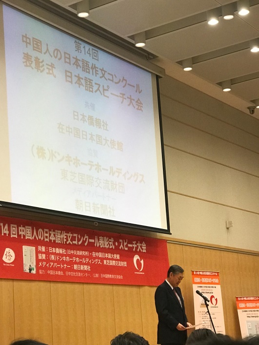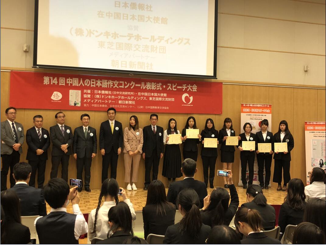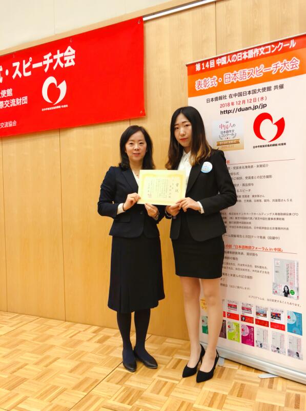 2018年正值中日邦交正常化45周年,中日友好交流呈现不断深入之势,由日本侨报社主办的第14届全中国日语作文大赛从今年5月份开始启动,共收到来自复旦大学、清华大学、中南财经政法大学、青岛大学、华东师范大学等235所知名院校的4288篇征稿。经过3轮长达半年的严正评审,我校16级李悦涵同学从全国众多知名高校、外语类重点高校的高年级选手中脱颖而出获得三等奖。颁奖典礼在北京日本驻华大使馆文化交流中心举行,日本驻华大使横井裕先生出席颁奖典礼。