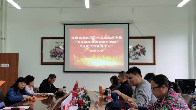 我院全体教师于2020年9月9日召开了纪念教师节暨“最受学生尊敬爱戴好教师”、“抗疫工作优秀个人”表彰大会。在此次会议中,党总支书记樊征宇同志作为本次会议的主持人,首先宣布英语系李婷老师、日语系张明老师、韩...